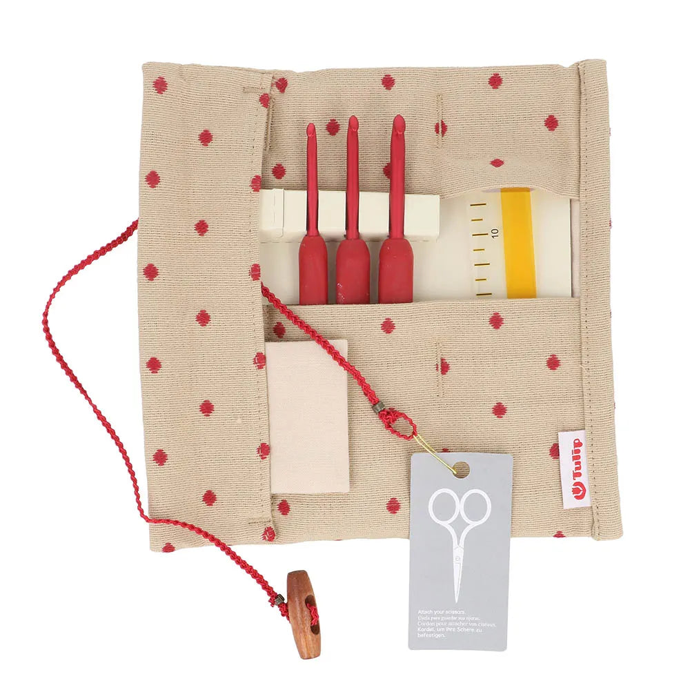 The Tulip Etimo Red Crochet Hook set contains 8 beautiful, bright red crochet hooks. Tulip is a Japanese brand that offers a wide range of superior quality products. The Etimo Red crochet hooks lie comfortably in your hand because of their ergonomic design with cushioned grip. The matte red tones ensure that light does not reflect and are thus gentle on the eyes. This set contains sizes 1.80, 2.00, 2.20, 2.50, 3.00, 3.50, 4.00, and 5.00mm. Included in the set are a ruler and 2 tapestry needles, stored in a fun spotted fabric carry case.